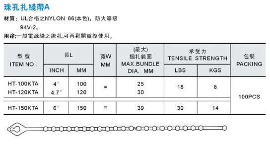 尼龙扎带故名思意就是用尼龙材料制作的捆扎东西的带子,设计有止退功能(活扣、珠孔除外)越拉越紧,也有可以拆卸的扎线带(活扣、珠孔)。材料:尼龙扎带采用UL(尼龙PA66)材料注塑制成,防火等级94V-2,具有耐酸、耐腐、绝缘不易老化、承受力极强。操作温度-40℃到+85℃。尼龙扎带由于产品的特殊性(薄壁、产品注塑流程比较大),其模具、注塑工艺和材料都相当讲究、一般新的厂家都需要很长的摸索过程才能生产出合格的产品。
