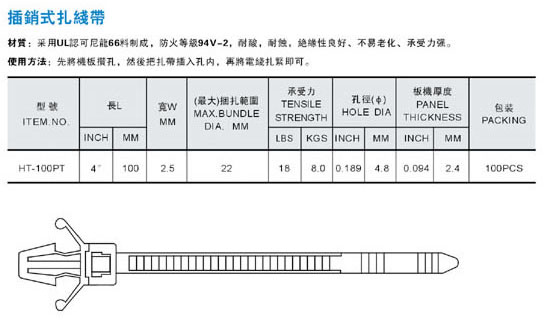 4、标牌式尼龙扎带采用UL认可尼龙66料制成,防火等级94V-2,耐酸蚀,不易老化。 特点:扎带前端设有空白标牌,可用油性笔在上面标志记号。